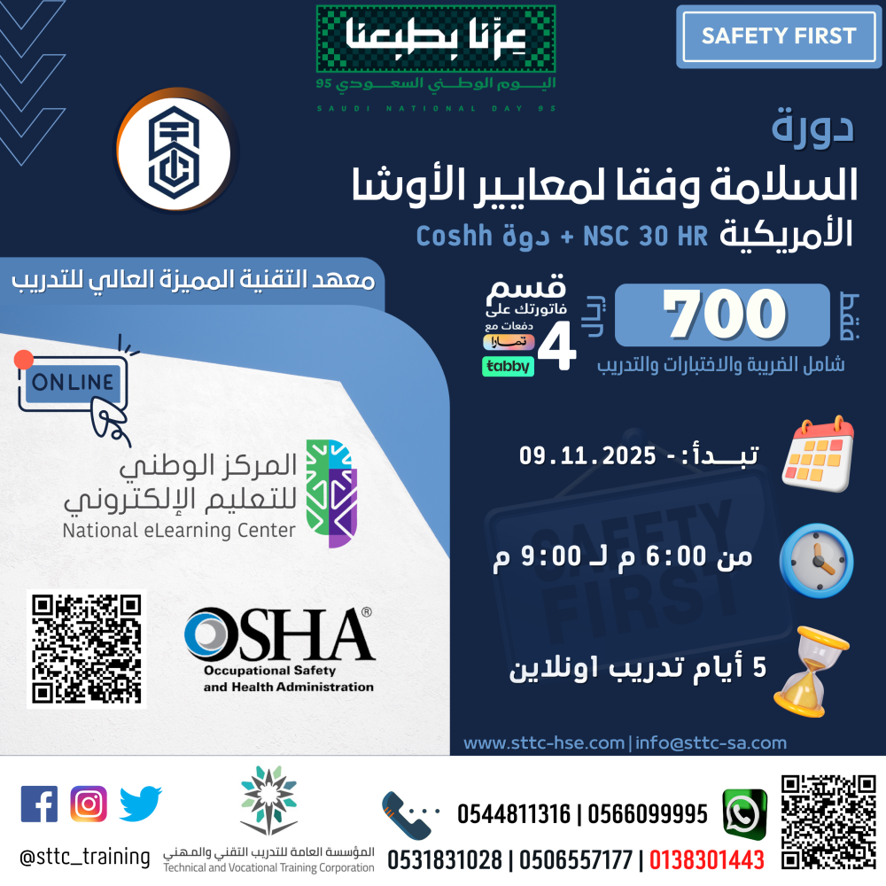 • شهادة السلامة وفق معايير OSHA الأمريكية من المؤسسة العامة للتدريب التقني والمهني.